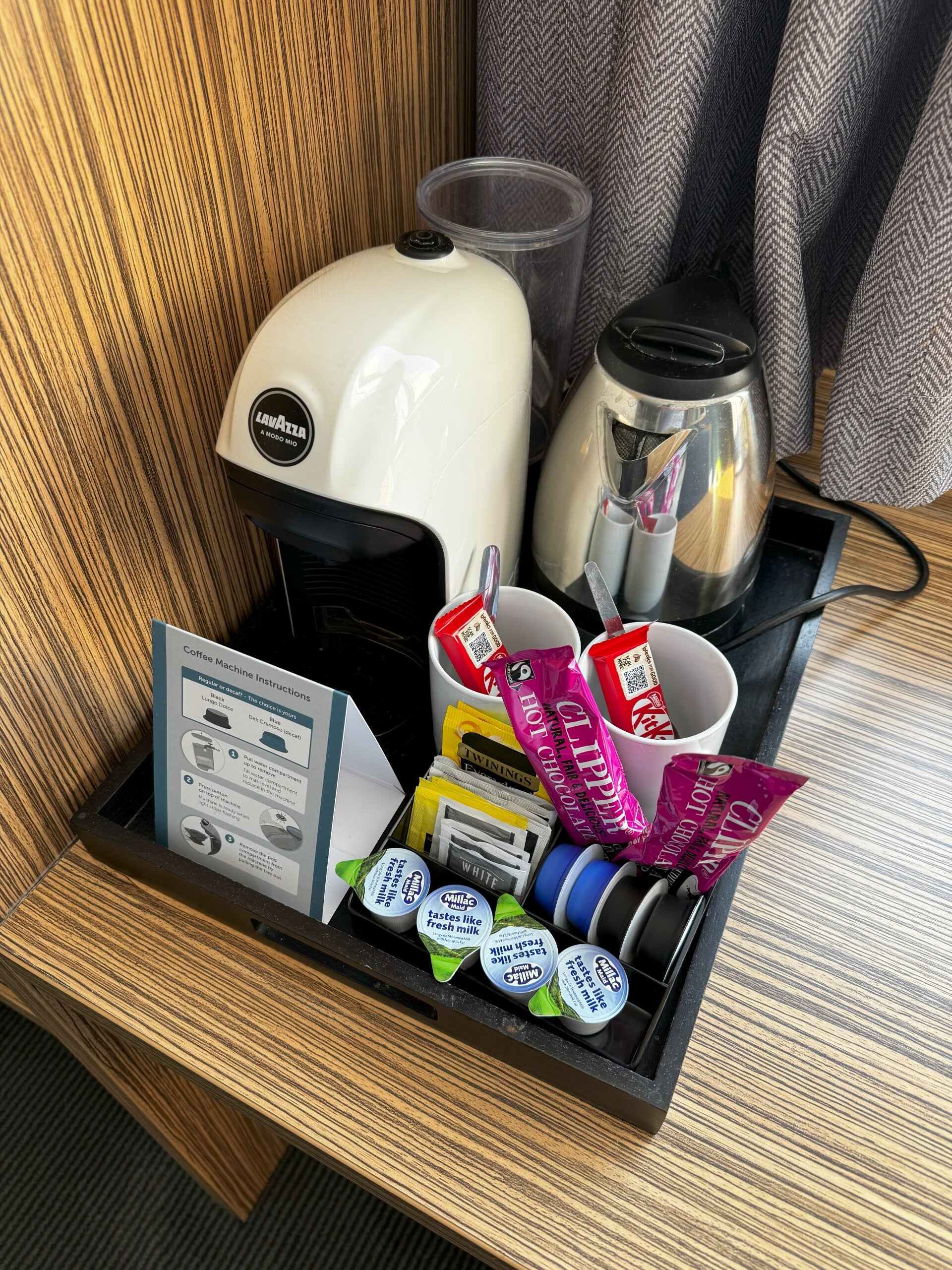 Oh yes. Though not quite up there with the offering at Premier Inn Plus, the Travelodge SuperRoom offers not only a Lavazza coffee machine with a choice of coffee pods, you also get two complimentary fun size Kit Kat's - Premier Inn Plus offers organic chocolates, but to be honest you can't really beat a Kit Kat.